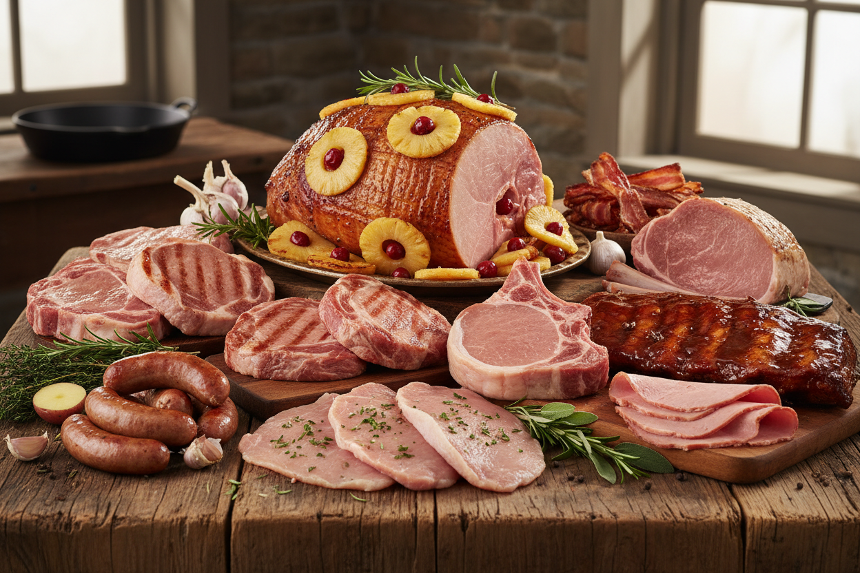 You will get Pork Steaks, Pork Chops, Bacon, Sausage (Medium), Ribs, Pork cutlets, Cured Ham Steaks, 1 Whole Cured Ham.